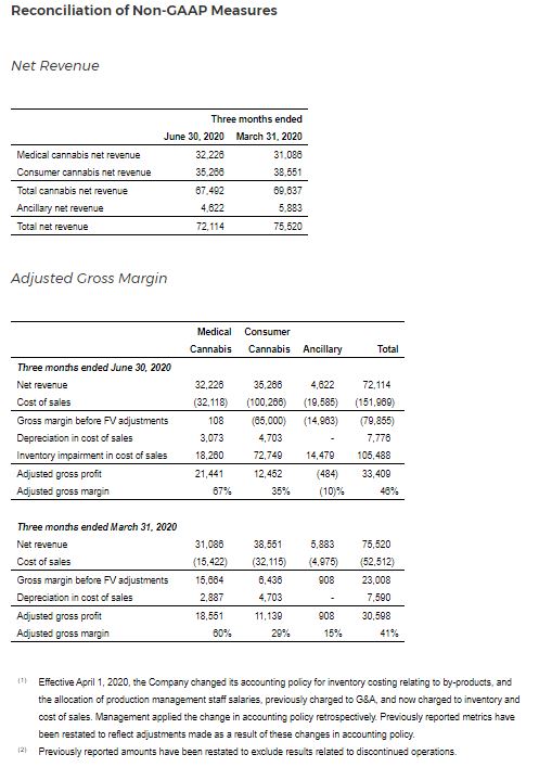 - Adjusted gross profit and gross margin before FV adjustments on medical cannabis net revenue represents adjusted gross profit and gross margin before FV adjustments on sales generated in the medical market only.