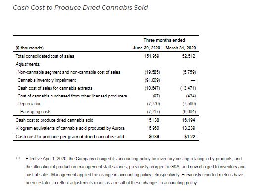 - Cash cost to produce dried cannabis sold is calculated by taking the cost of sales, excluding the effect of changes in the FV of biological assets and inventory, and deducting non-cash production costs, cannabis extract conversion costs, cost of accessories, cost of products purchased from other Licensed Producers that were sold, cost of sales from non-cannabis producing subsidiaries, inventory impairments, and packaging costs (i.e. post-production costs). Cash cost to produce per gram of dried cannabis sold is calculated by taking cash cost to produce dried cannabis sold divided by total grams of dried cannabis sold in the period that was produced by Aurora. Management believes these measures provide useful information about the efficiency of our production of cannabis.