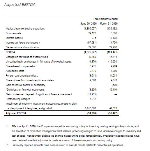 - Adjusted EBITDA is calculated as net (loss) income excluding interest income (expense), accretion, income taxes, depreciation, amortization, changes in fair value of inventory sold, changes in fair value of biological assets, share-based compensation, acquisition costs, foreign exchange, changes in fair value of financial instruments, gains and losses on deemed disposal, and non-cash impairment of intangibles, goodwill, inventory, property, plant and equipment and other assets. Adjusted EBITDA is intended to provide a proxy for the Company’s operating cash flow and is widely used by industry analysts to compare Aurora to its competitors, and derive expectations of future financial performance for Aurora. Adjusted EBITDA increases comparability between comparative companies by eliminating variability resulting from differences in capital structures, management decisions related to resource allocation, and the impact of FV adjustments on biological assets and inventory and financial instruments, which may be volatile and fluctuate significantly from period to period.