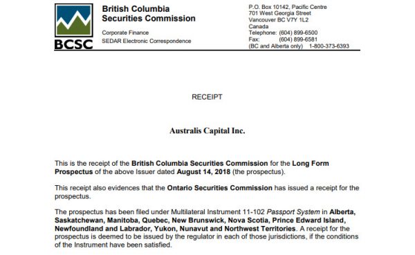 EDMONTON, Aug. 17, 2018 /CNW/ – Further to its press release of June 20, 2018, Aurora Cannabis Inc. (“Aurora” or the “Company”) (TSX: ACB) (OTCQB: ACBFF) (Frankfurt: 21P; WKN: A1C4WM) today announced, in connection with the spin-out of its subsidiary Australis Capital Inc. (“Australis”), Australis has received a receipt for its final prospectus dated August 14, 2018 (the “Final Prospectus”). The Final Prospectus was filed with the securities regulatory authorities in all provinces and territories of Canada and is available under Australis’ SEDAR profile at www.sedar.com. Receipt of the Final Prospectus will permit Aurora’s Board of Directors (the “Board”) to set the Record date of the transaction, which the company expects the Board will announce within the coming days. Additionally, Australis received conditional approval to list its shares and warrants on the Canadian Securities Exchange (“CSE”), as well as completed an oversubscribed private placement for proceeds of $17 million.