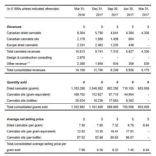 Total product sold for the period was 1,352,982 grams of dried cannabis and cannabis oils, up 107.2% as compared to the third quarter of 2017, and up 16.5% from Q2 2018.