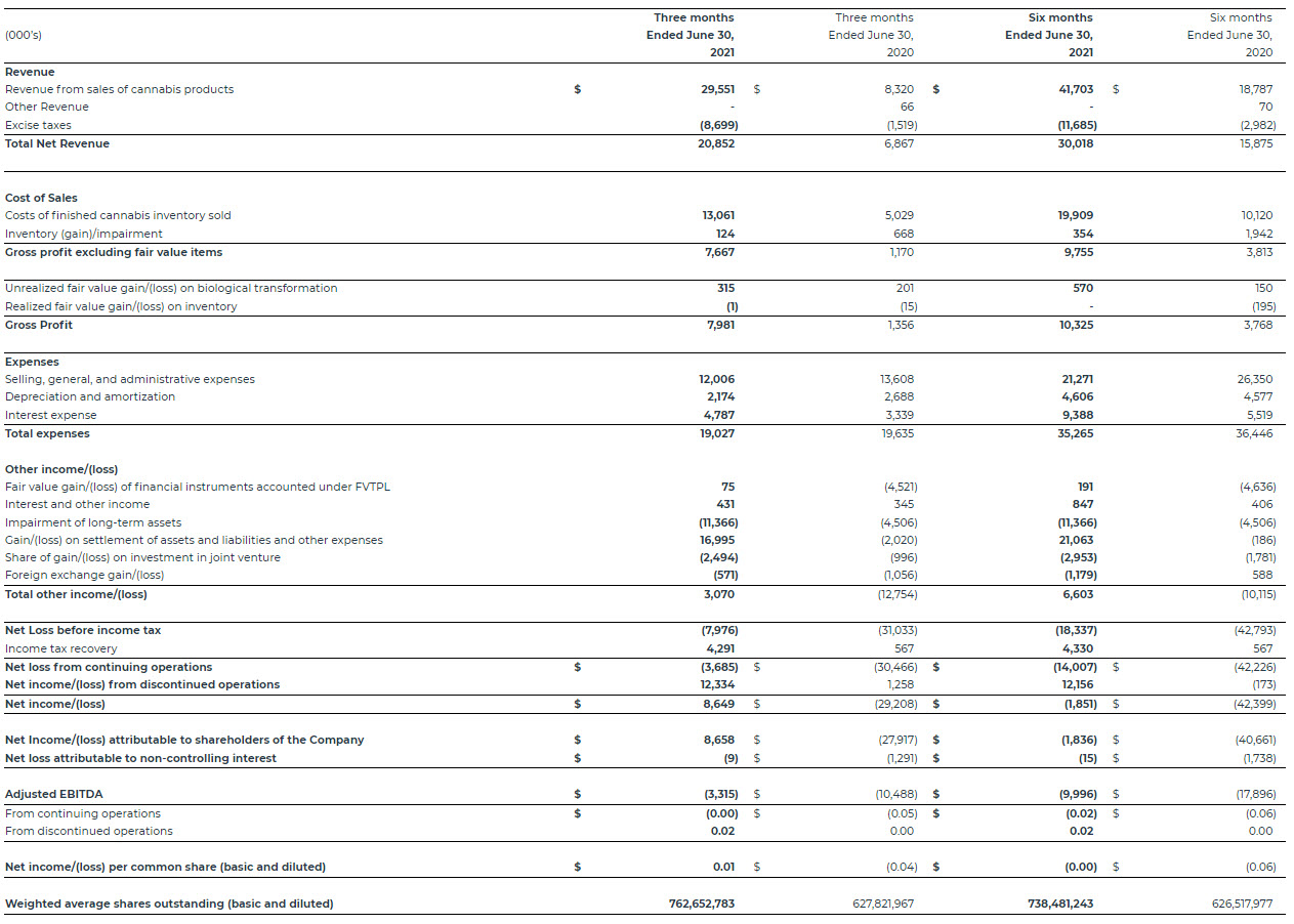 Net income attributable to shareholders of the Company was $8.7 million for the three months ended June 30, 2021, representing a net income of $0.01 per share on a basic and diluted basis. Net loss attributable to shareholders of the Company was $1.8 million for the six months ended June 30, 2021, representing a net loss of $0.00 per share on a basic and diluted basis. The improvement in net income and loss positions was a result of net income of $12.3 million related to the sale of KGK, recognition of a gain from the Imperial Brands Debenture Amendments, improvements in continuing operating gross profits and income tax recoveries, partially offset by an impairment charge related to the Curative sale.