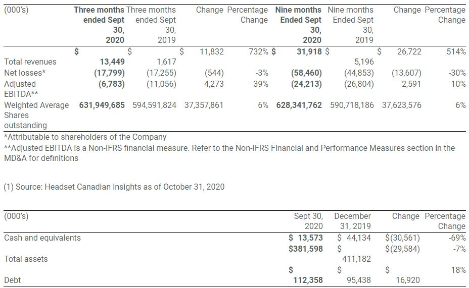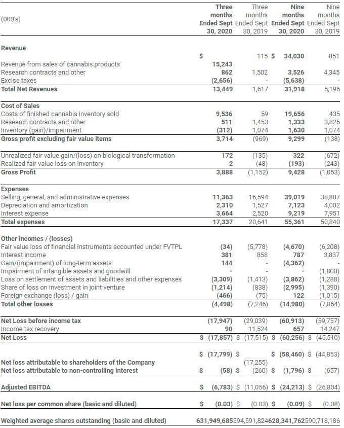 - Total net revenues of $13.4 million for the three months ended September 30, 2020, comprised of $12.6 million of cannabis net revenues, an 85% increase from the previous quarter, and research revenues from KGK of $0.9 million.