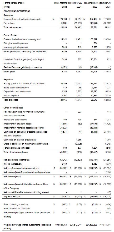 Net losses attributable to shareholders of the Company were $60.1 million for the three months ended September 30, 2022, representing a net loss of $0.07 per share on a basic and diluted basis. The net loss of $118.7 million through nine months of 2022 includes the net impact of approximately $25.7 million related to the closure of the Auxly Annapolis and Auxly Annapolis OG facilities during the first quarter of 2022.