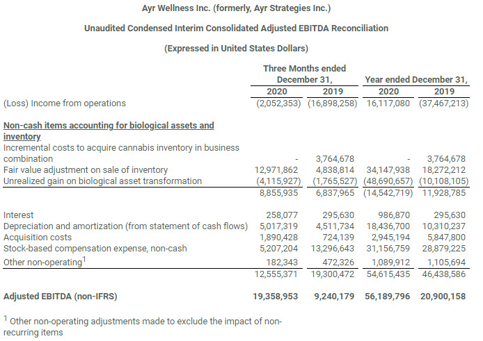 A reconciliation of how Ayr calculates Adjusted EBITDA is provided below. Additional reconciliations of Adjusted EBITDA and other disclosures concerning non-IFRS measures is provided in our MD&A for the year ended December 31, 2020. As well, the Company reminds you that Adjusted EBITDA is a non-IFRS measure.