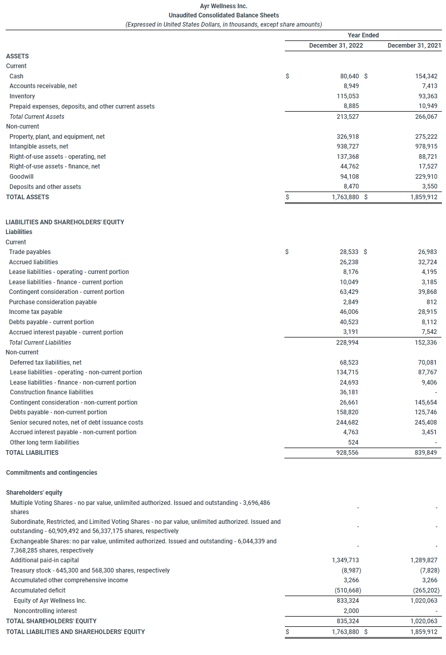 Certain financial information reported in this news release is extracted from Ayr’s Consolidated Financial Statements and MD&A for years December 31, 2022 and 2021. Ayr files its financial statements and MD&A on SEDAR and with the SEC. All financial information contained in this news release is qualified in its entirety by reference to such financial statements and MD&A.