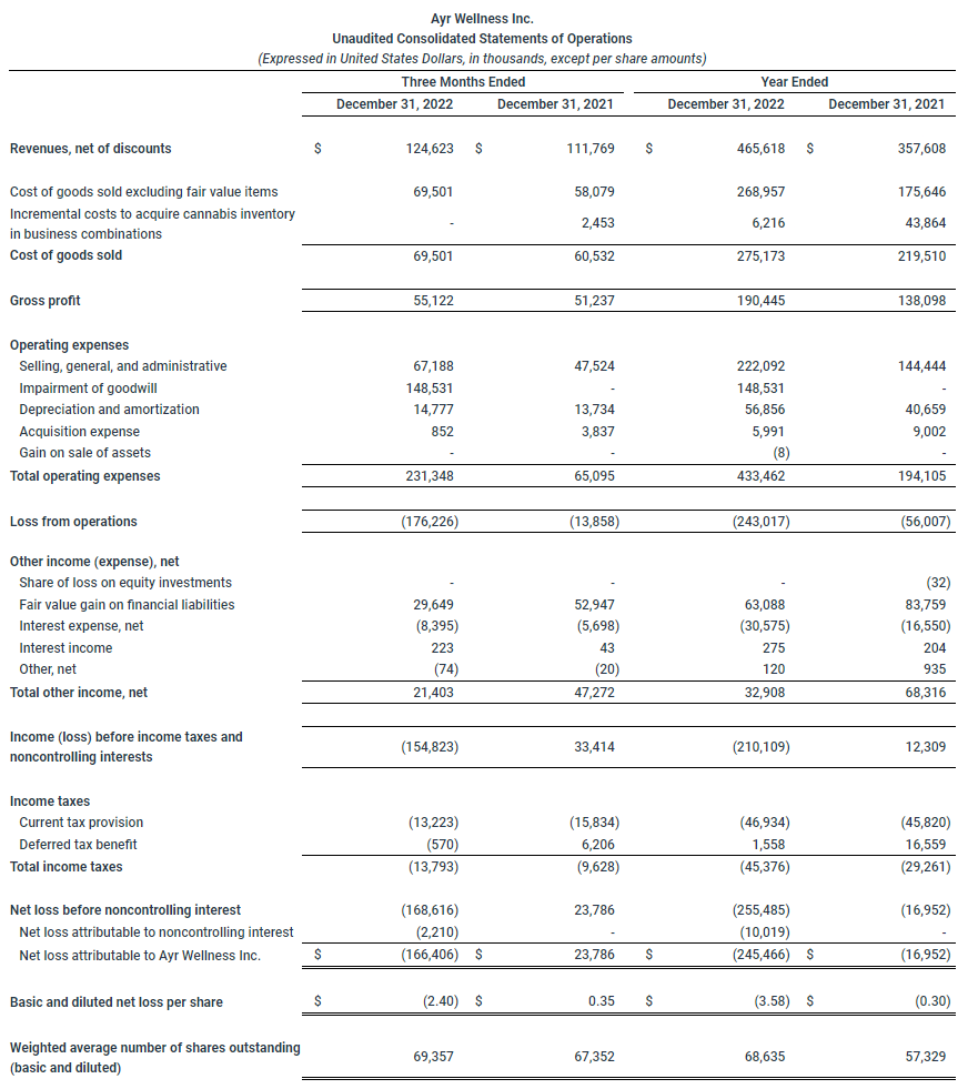 MIAMI, March 09, 2023 (GLOBE NEWSWIRE) — Ayr Wellness Inc. (CSE: AYR.A, OTCQX: AYRWF) (“Ayr” or the “Company”), a leading vertically integrated U.S. multi-state cannabis operator (“MSO”), is reporting financial results for the fourth quarter and full year ended December 31, 2022. Unless otherwise noted, all results are presented in U.S. dollars.