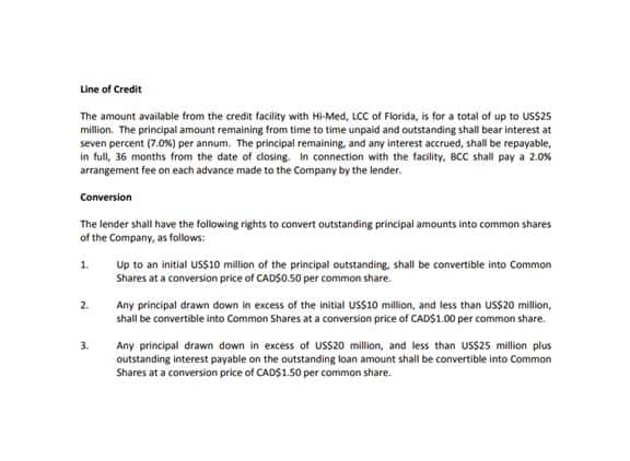The lender shall have the right to convert outstanding principal amount of the initial drawdown plus any accrued interest (accruing at the rate of 7% per annum calculated and compounding on a monthly basis) into common shares of the Company at a conversion price of CAD$0.50 per common share.