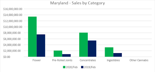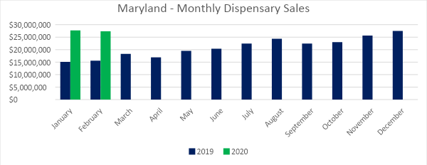 In February 2020, Cannabis sales in Maryland’s medical dispensaries reached $27.4 million, a one percent decline from January. Compared to the previous February, sales in Maryland increased by nearly 76 percent. Year-to-date through February, sales reached $55 million, a $24.4 million increase from the same period last year.