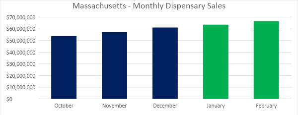 In February 2020, Cannabis sales in Massachusetts’s medical and adult use channels totaled at $66.6 million, growing five percent since January. Year-to-date through February, sales have exceeded $130.2 million.