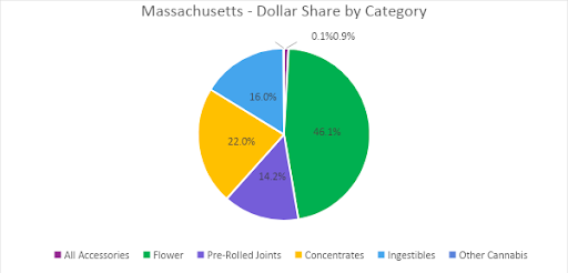 Concentrate sales accounted for nearly 22 percent of overall February revenues with sales totaling $14.6 million. Vape products, the largest segment of the Concentrates category, generated $10.4 million in sales. The category made up 71 percent of the Massachusetts Concentrates market and 16 percent of sales across all categories.