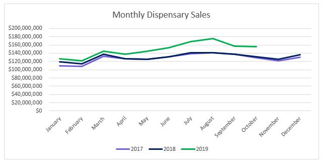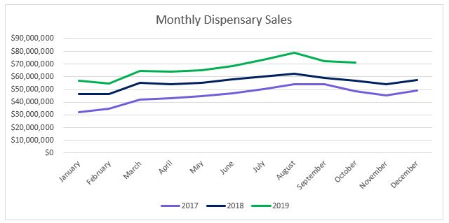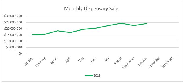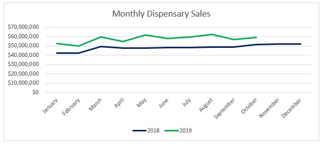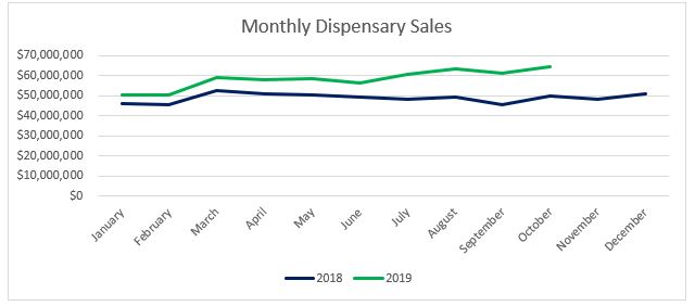 Sales for Arizona’s medical dispensaries were $64.5 million this past October, a five percent increase from September. Compared to October 2018, sales increased over 29 percent. Year-to-date through October, sales have reached $583.7 million, a $94.7 million increase from the same period last year.
