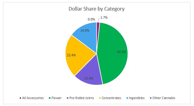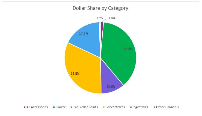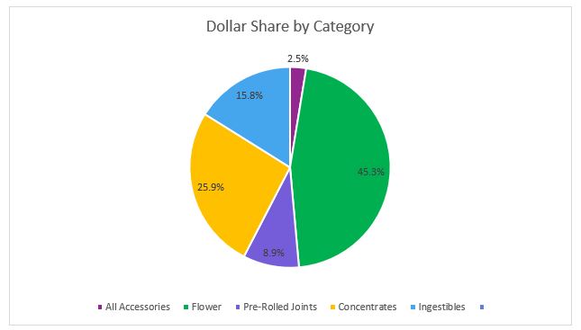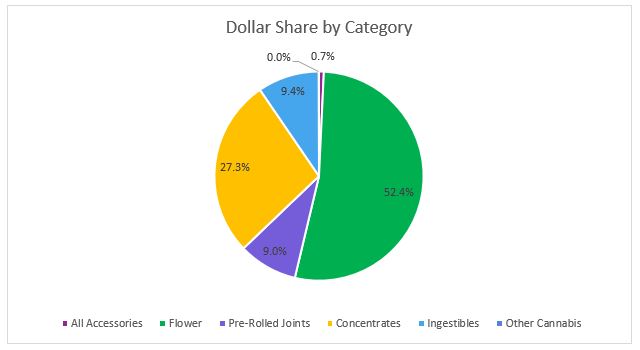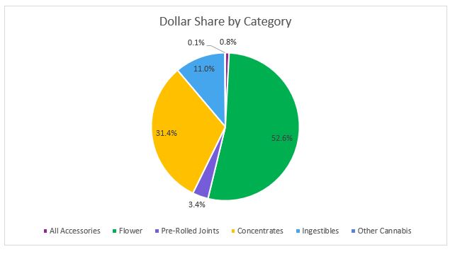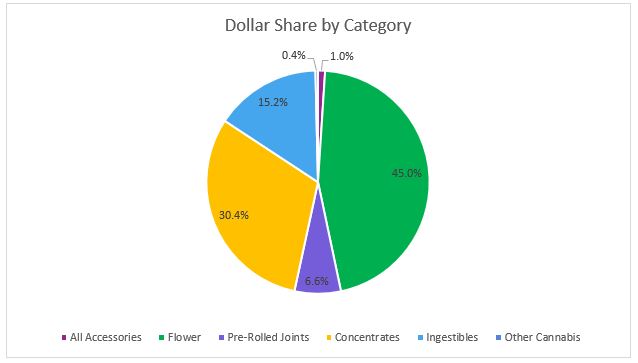 In October, Flower sales reached $12.7 million, accounting for more than 52 percent of overall revenues for the month. Compared to the trailing month, the average retail price of flower declined a little over one percent but revenues in the category increased one percent on high sales volume.