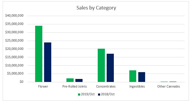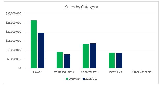 Sales within the Concentrates category contributed nearly 26 percent towards revenues in October. The $18.4 million in Concentrates sales represented ten percent growth from October 2018. Compared to the trailing month, concentrate sales declined four percent. The decline in sales for the category were driven by a nine percent decline in the vape segment. In October 2019, vape sales were 12 percent lower than a year earlier.
