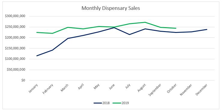 Flower sales reached $26.3 million in October 2019, contributing 44 percent towards overall sales revenue. Flower sales increased by more than five percent from the trailing month and have increased by 34 percent compared to October 2018. Year-to-date through October, Flower sales have increased 20 percent compared to 2018, reaching $241.3 million.