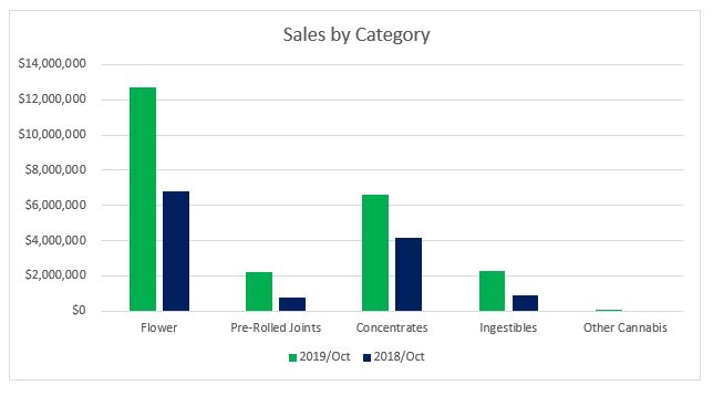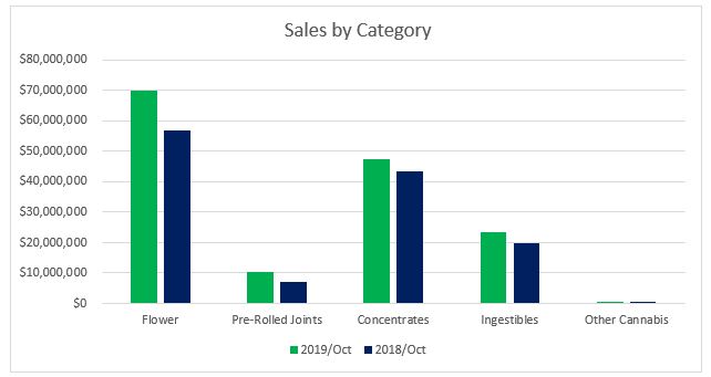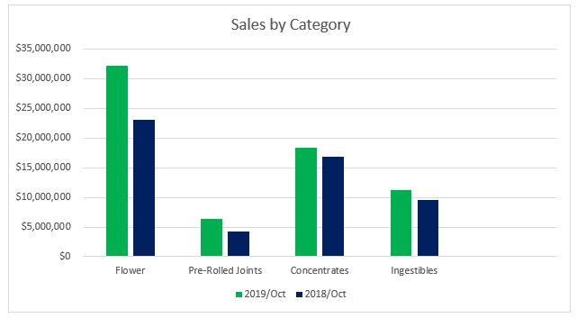 The $6.3 million generated from Pre-Rolled Joints in October 2019 contributed nine percent towards overall revenues for the month. Compared to October 2018, sales increased 46 percent. Year-to-date through October, sales in the category grew more than 20 percent compared to the year prior.