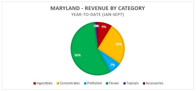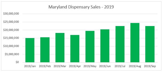 Sales for Maryland’s medical dispensaries were $22.5 million this past September, an eight percent decline from the trailing month. Year-to-date through September, sales across all product categories have reached $175.1 million. New dispensaries are opening each month and as access increases so are sales. Sales in Q3 increased 22 percent from the trailing quarter.