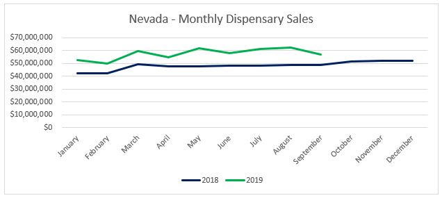 Combined sales for Nevada’s medical and recreational dispensaries totaled at $56.9 million this past September, a nine percent decrease from August. Compared to September 2018, sales increased by 16 percent overall. Year-to-date through September, sales have increased 22 percent compared to the same period in 2018, reaching $516.7 million.