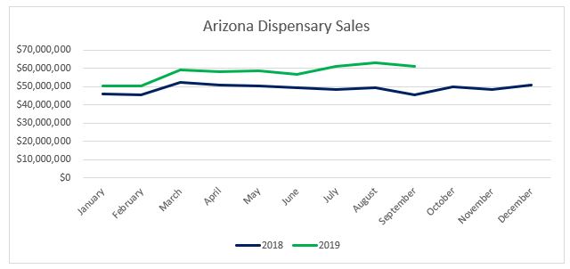 Sales for Arizona’s medical dispensaries were $61.4 million this past September, a three percent decrease from August. Compared to September 2018, sales increased over 35 percent. Year-to-date through September, sales have reached $519.2 million, an $80.2 million increase from the same period last year.
