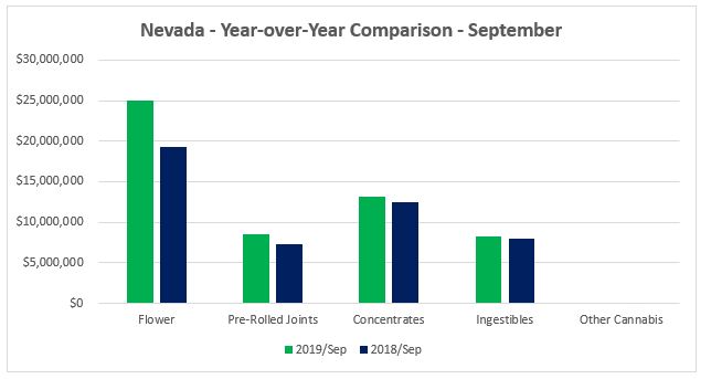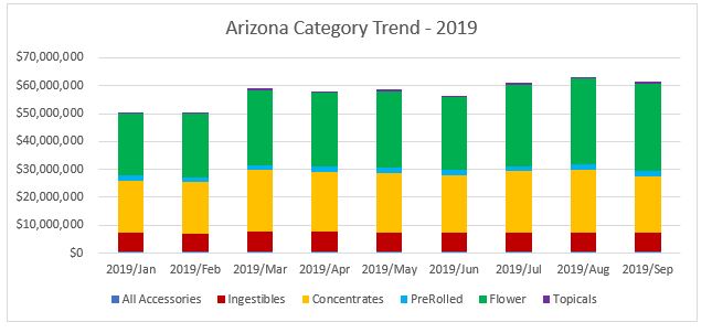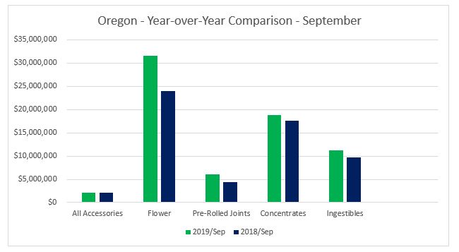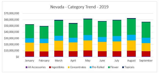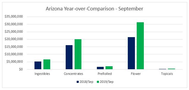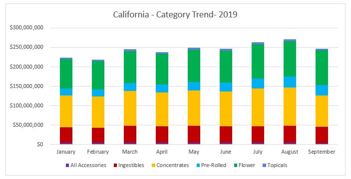 The Concentrates product category accounted for 33 percent towards overall revenues in September. The $20.2 million in Concentrates sales represented 25 percent growth compared to September 2018. Year-to-date through September, sales of concentrates have increased 18 percent compared to the same period last year, reaching $186.4 million. Vape products are the largest segment within concentrates, compared to the previous September vape sales increased 25 percent but compared to the trailing month revenues from vape decreased 14 percent.