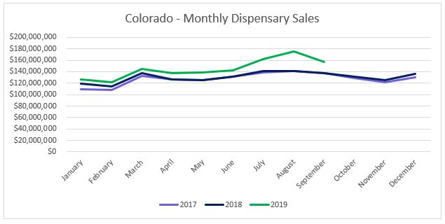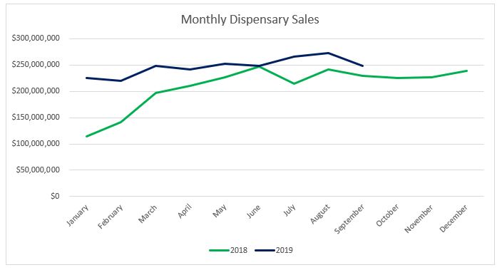 Sales from Colorado’s adult-use and medical dispensaries reached a combined $156.6 million this past September, an eleven percent decrease from August. The September slowdown reflects both a seasonal slowdown as well as fallout from significant declines in the vape category. Compared to September 2018, sales increased by 14 percent. Year-to-date through September, sales in the Centennial state reached an impressive $1.3 billion, a 13 percent increase from the same period in 2018.