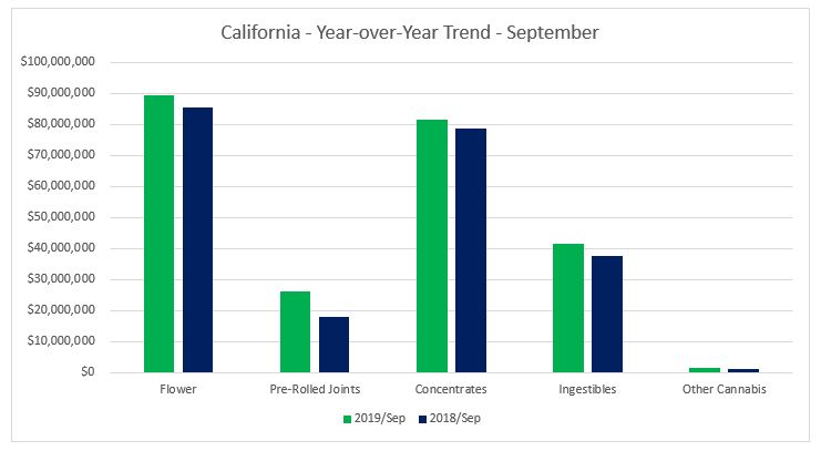 In September, Flower contributed over 36 percent towards overall revenues with $89.5 million in sales. Compared to August, sales in the category decreased two percent; compared to September 2018, sales increased five percent. Year-to-date through September, sales of Flower have reached $745.5 million, a six percent increase compared to the same time period in 2018. Contributing nearly 11 percent towards overall revenue in California, Pre-Rolled Joints sales generated $26.3 million this past September, a 47 percent increase compared to September of 2018. Year-to-date through September, sales of Pre-Rolled Joints have increased 43 percent, reaching just over $200 million.
