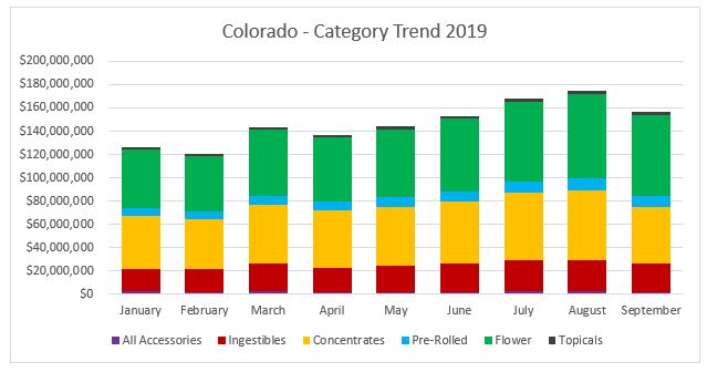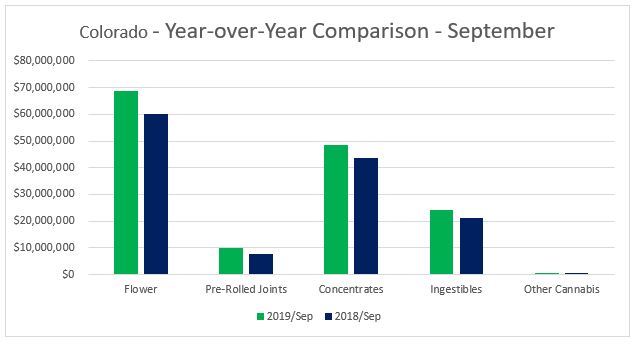 Sales of Concentrates contributed nearly 33 percent of revenues for the month of September. A decline from past months when concentrates were a larger category than flower. The $81.4 million in Concentrates sales represented a decrease of 18 percent from the trailing month, but more than three percent growth compared to September 2018. Year-to-date through September, Concentrates dollar sales increased by over 34 percent compared to the same time period in 2018, reaching $799 million.