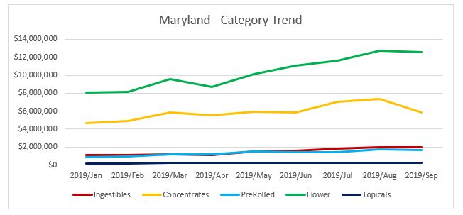 Pre-Rolled Joints remain a small category in Maryland’s medical-only market. Sales of Pre-Rolled Joints were $1.7 million in September, $4.9 million in Q3 and $12 million in year-to-date through September. Compared to the trailing month, sales in September declined five percent but remain up 19 percent over the previous quarter.