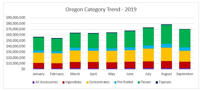 Oregon dispensary sales reached $70.9 million this past September, a ten percent decrease from August. Compared to September 2018, sales increased by 20 percent. Year-to-date through September, sales have also increased by 20 percent compared to the same period in 2018, reaching about $596.5 million.