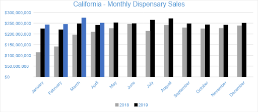 In April 2020, cannabis sales for state licensed retailers and delivery services reached $252 million, declining by nine percent from the trailing month and growing four percent compared to April 2019. Year to date, sales in California have reached over $1 billion, a nine percent increase compared to the same period in 2019.