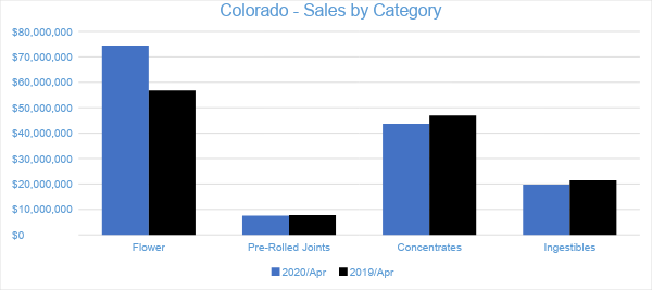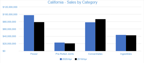 Sales from Flower generated $97.5 million in April 2020, accounting for nearly 39 percent of overall revenues. Compared to the trailing month and April 2019, Flower sales decreased by six percent and grew 24 percent, respectively. Pre-rolled Joints, which are tracked as a separate category, accounted for more than nine percent of overall April revenues with $23.2 million in sales.