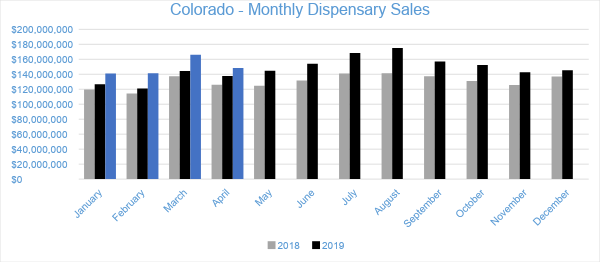 April 2020 sales in Colorado’s adult-use and medical dispensaries reached a combined $148.4 million, declining nine percent from March. Compared to the previous April, sales increased by nearly eight percent. Adult-use sales grew by one percent from April 2019 while medical sales grew by 34 percent. Year-to-date through April, combined channel sales have reached $593.1 million, increasing 12 percent from the same period last year.