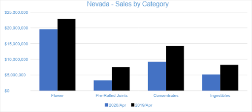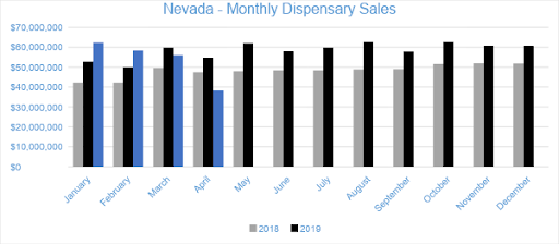 In April, Nevada dispensaries generated $38.3 million in sales. Compared to the trailing month, sales declined by 32 percent. Year-to-date through April, sales in the market have reached $214.8 million, decreasing by one percent over the same period last year.