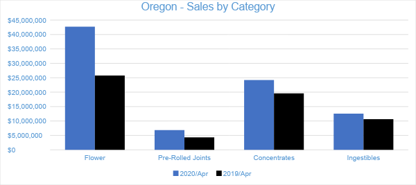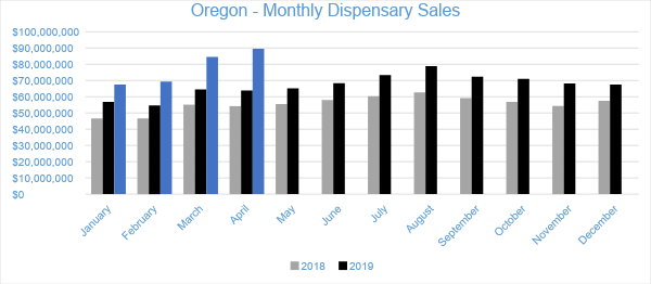 In April 2020, Cannabis sales in Oregon’s medical and adult-use dispensaries reached $89.5 million. Compared to the trailing month, sales in the Oregon market grew by about six percent. Compared to April 2019, sales grew by 40 percent overall. Year-to-date sales in Oregon have reached $311 million, growing by 30 percent compared to the same period in 2019.