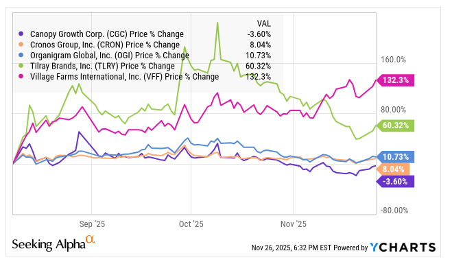Canadian LP stocks have been quite strong this year. I will provide an update on Friday regarding the action in November, but the NCV Canadian Cannabis LP Index ended today at 59.32, which leaves the 13-stock index up 18.4% in 2025. Some readers may attribute the rally to Village Farms, but Village Farms is not in the index due to it being listed only on the NASDAQ. Village Farms is in the NCV Global Cannabis Stock Index, which is down 11.1% year-to-date. It is also in MSOS, which is down 10.0% in 2025 so far.