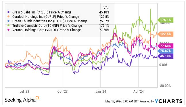 Each of these stocks has outperformed the Global Cannabis Stock Index, up 39.2%, over the past year. A year ago, Trulieve was very out of favor. Going back to the end of 2022, it is up a lot, but it is not the leader: