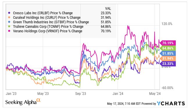 In addition to Trulieve and Verano, AYR Wellness and Curaleaf are big operators in the Florida medical cannabis market, with 125 stores between the two of them. The four of these, then, have 336 dispensaries in Florida, which is 53% of all dispensaries in the state. AYR Wellness, which is up 59.2% in 2024, has gained 139.2% since the end of 2022, ahead of the five largest MSOs.