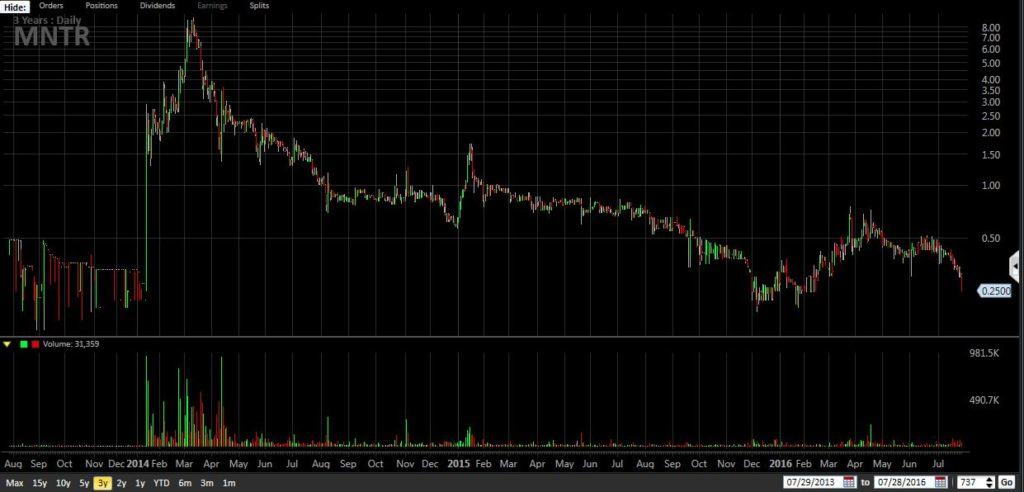 The stock chart over the past few years shows the huge jump in both price and trading volume in MNTR at the beginning of 2014, though this was a widespread phenomenon at the time. The Cannabis Stock Index has declined by 97% since peaking in March of 2014, similar to the decline in MNTR: