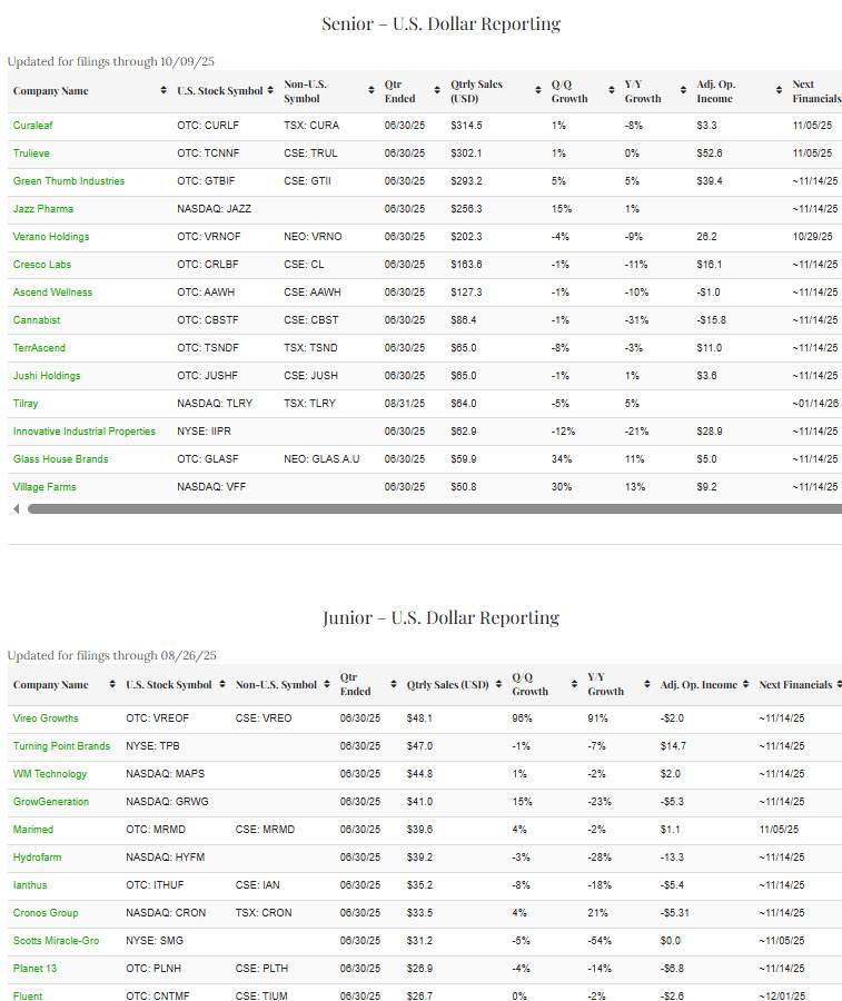 At the time of our last update on August 13th, 16 companies qualified for inclusion on the senior lists, including 13 filing in U.S. dollars and 3 in the Canadian currency, and the junior list had 11 companies. Now, 14 companies that file in U.S. dollars and 5 that file in Canadian dollars are qualifying for the senior lists, a total now of 19. The junior list includes 11 companies reporting in U.S. dollars and 1 in Canadian dollars. On a combined basis, the Public Cannabis Company Revenue & Income Tracker now includes 31 companies. One company, Glass House Brands (OTC: GLASF) (NEO: GLAS.A.U) moved from the American Junior list to the Senior list. The American Junior list added Fluent (OTC: CNTMF) (CSE: FNT.U). In Canada, Auxly Cannabis (OTC: CWBTF) (TSX: XLY) joined the Junior list.