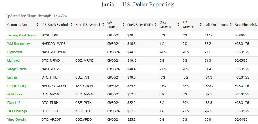 At the time of our last update on October 30th, 19 companies qualified for inclusion on the senior lists, including 16 filing in U.S. dollars and 3 in the Canadian currency, and the junior list had 17 companies. Now, 16 companies that file in U.S. dollars and 4 that file in Canadian dollars are qualifying for the senior lists, a total now of 20. The junior list includes 11 companies reporting in U.S. dollars and 1 in Canadian dollars. On a combined basis, the Public Cannabis Company Revenue & Income Tracker now includes 32 companies. Four companies were removed from the Junior List due to M&A, bankruptcy or being late in SEC filings. Of the Canadian cannabis reporters, Canopy Growth returned to the Senior List.