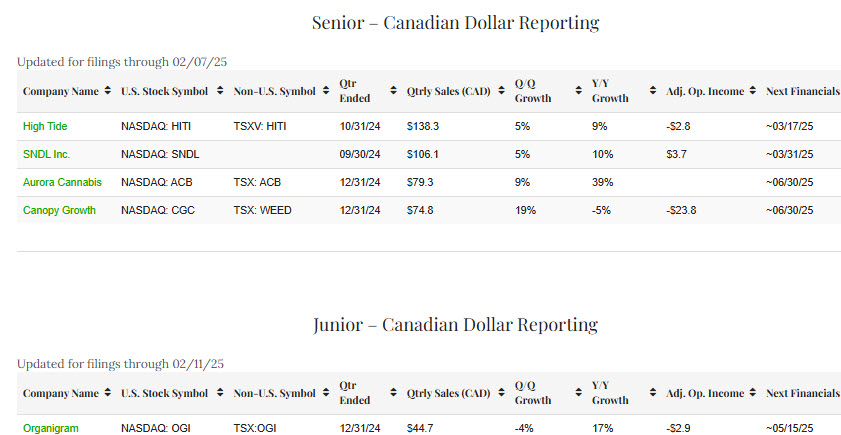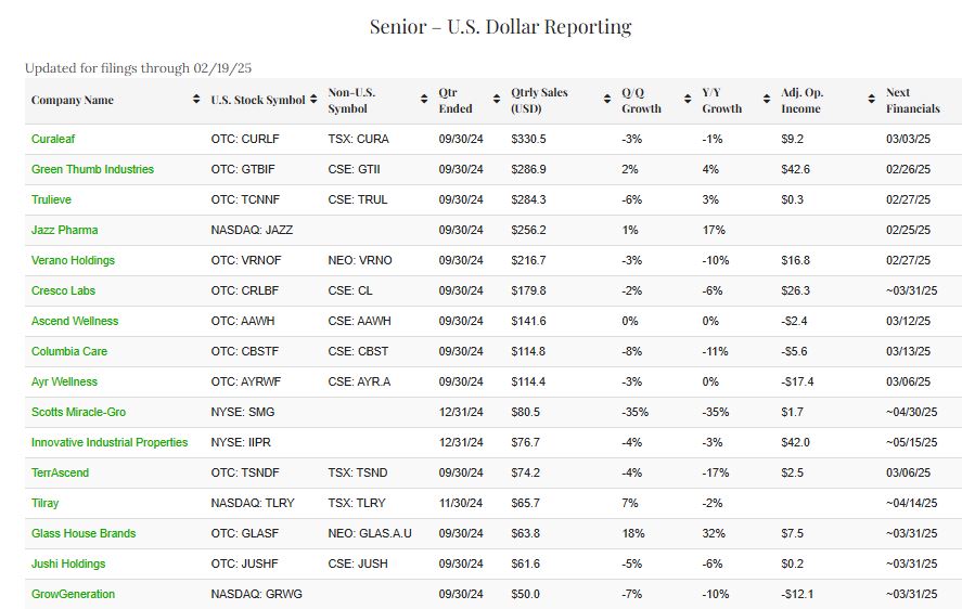 This data-driven, fact-based tracker will continually update based on new financial filings so that readers can stay up to date. Companies must file with the SEC or SEDAR and be current to be considered for inclusion. When we launched this resource in May 2019, companies with quarterly revenue in excess of US$2.5 million qualified. As the industry has scaled and as more companies have gone public, we have raised the minimum several times subsequently, including a move to US$5 million in October 2019, to US$7.5 million in June 2020, to US$10 million in November 2020, US$12.5 million in August 2021 and US$25 million in September 2021. Due to the rapid growth in the cannabis industry, we raised the minimum again in May 2024. The senior list has a minimum of US$50 million (C$71.1 million), and the junior list now has a minimum of US$25 million (C$35.6 million).