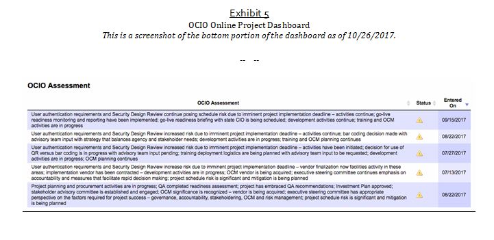 3. Finally, the OCIO’s online project dashboard’s OCIO Assessment reads, “user authentication requirements and Security Design Review increase risk due to imminent project implementation deadline” (emphasis mine) for 07/13/2017, 07/27/2017, 08/22/017, and 09/15/2017. Now, I don’t know what this means, and to be fair I only just found this today and have not given the WSLCB an opportunity to help me understand what this comment means, but my current interpretation is that on each of those dates, the Security Design Review continued to increase the risk that the project would not be completed on time because the review remained ongoing as the system was being developed (see “Exhibit 5”).