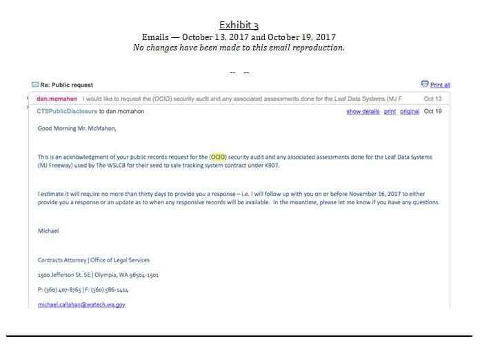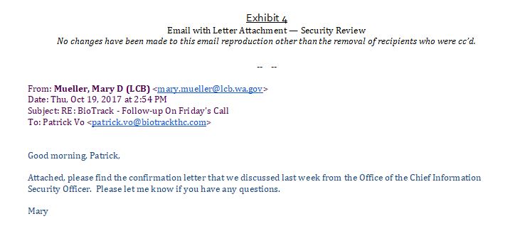 Later that day, the WSLCB sent to me a letter from the State of Washington Office of Cyber Security (see “Exhibit 4”). The letter states, “We have completed our security design review on the new cannabis traceability system provided by Leaf Data Systems vendor MJ Freeway… the project, as proposed, uses appropriate security controls and methods to meet OCIO IT security standards at the time of review.” Though we greatly appreciate the efforts of the WSLCB staff to obtain this letter, it does not provide much information or the peace of mind that we are seeking.