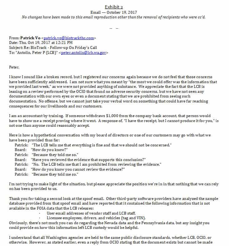 On October 17th, I received an email from the WSLCB stating that BioTrack’s “concerns were addressed already.” Up to that point, we had received only verbal assertions and nothing in writing. One part of my October 19th email (see “Exhibit 2”) contained the following response: