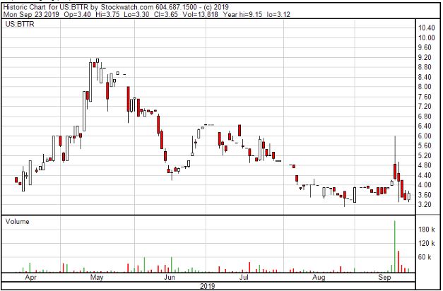 The company, which was formerly known as Sport Endurance, entered the CBD space with a $2.2 million acquisition of TruePet LLC in December (paid with the isusance of 14.08 million shares) and changed its name in March. It later acquired Bona Vida by issuing 18 million shares. Note that these share amounts are after a 1-26 reverse split conducted in March. The company is delinquent in its quarterly SEC filings but last reported approximately 41 million shares outstanding. The stock of Better Choice, which responded favorably initially to the news of Linton’s role but then sold off, has very low trading volume:
