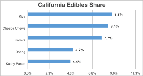 Moxie Seeds & Extracts (7.7%) maintains its top position among California concentrates brands overall, thoug After registering large gains in distribution, West Coast Cure (3.2%) and Bloom Farms (2.3%) both broke into the top 5 for the first time.