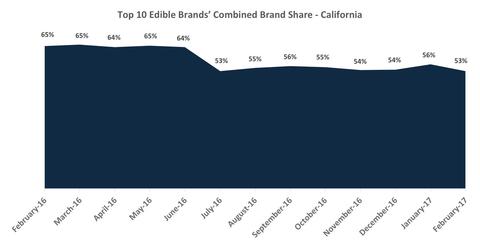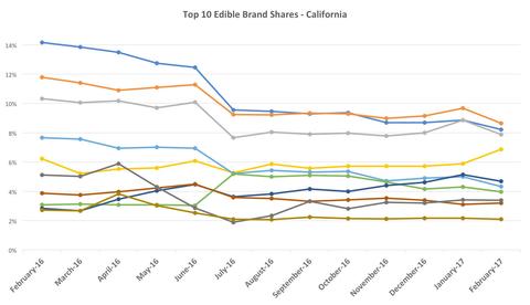 Using its proprietary data, Brightfield Group tracked the evolution of the top ten edible brands in California from February 2016 to February 2017. Here are our three big takeaways: