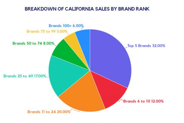 The California marketplace sees similar brand concentration to other markets with the Top 5 Brands (by sales volume) in California making up 32% of total sales.
