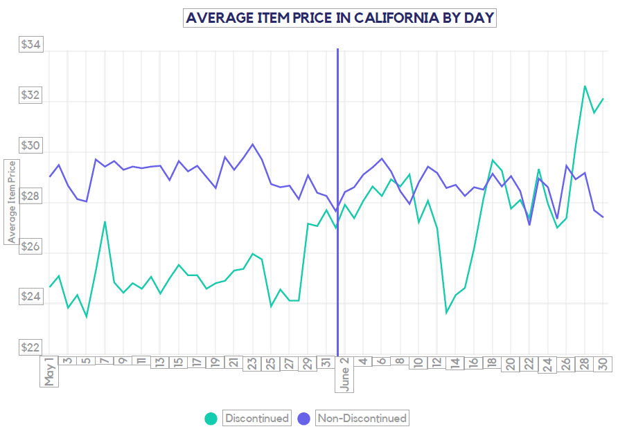 By the last week of June over 45% of the products that were to be discontinued had already stocked out at stores. Lower priced items sold out first. After the cheaper products stocked out consumes turned to the pricier products. The increase in average item price at the end of the month is due to only high priced items remaining at the end rather than stores marking up items.