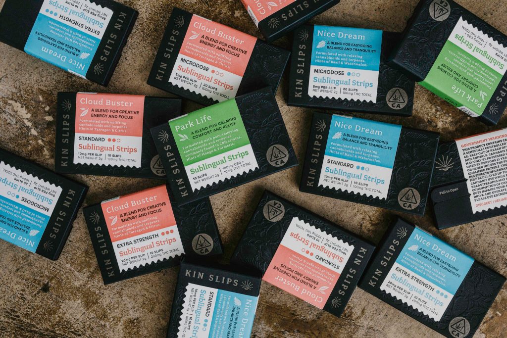 When cannabis is smoked or vaped, some of the product is lost through residual smoke. When consumed as an edible, much of the cannabis is metabolized before it reaches the bloodstream. Instead of these delivery methods, Kin Slips produces sublingual strips. Placed under the tongue, the blend of cannabinoids and terpenes in each strip is absorbed directly into the bloodstream, and the user feels the effects within 10 to 15 minutes.